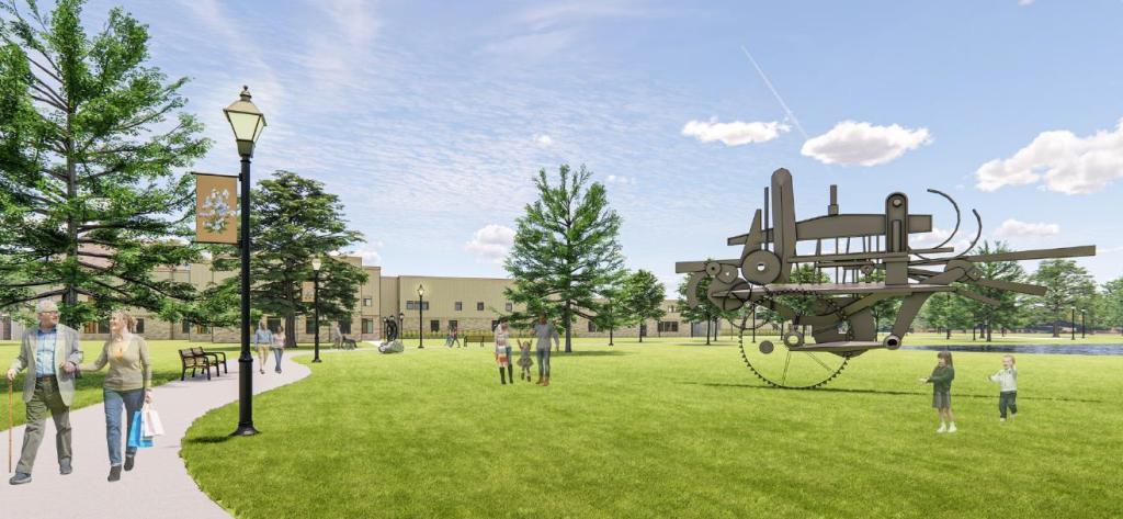 Sculptures in the gardens, utilizing sustainable strategies from solar panels installation to rain water collection, prioritizing connection—to nature, to community, and to self—Forget Me Not Memory Care Housing offers a forward-thinking