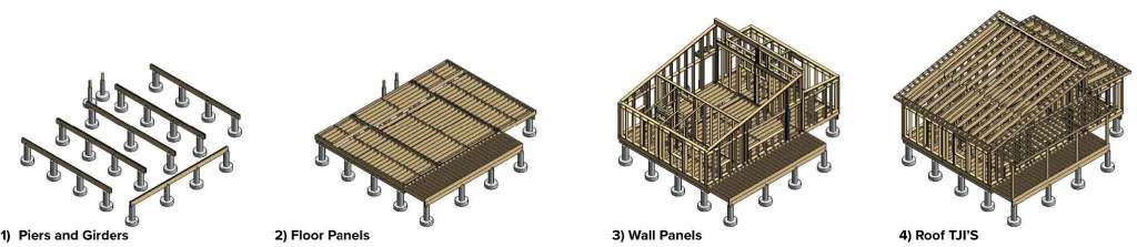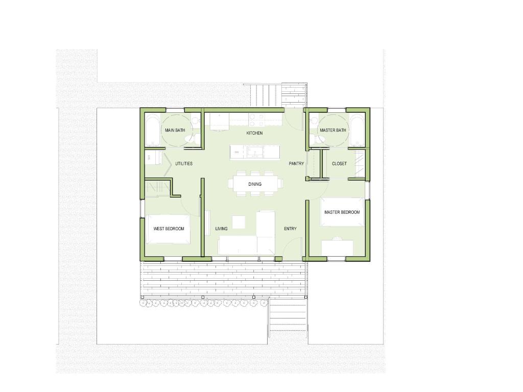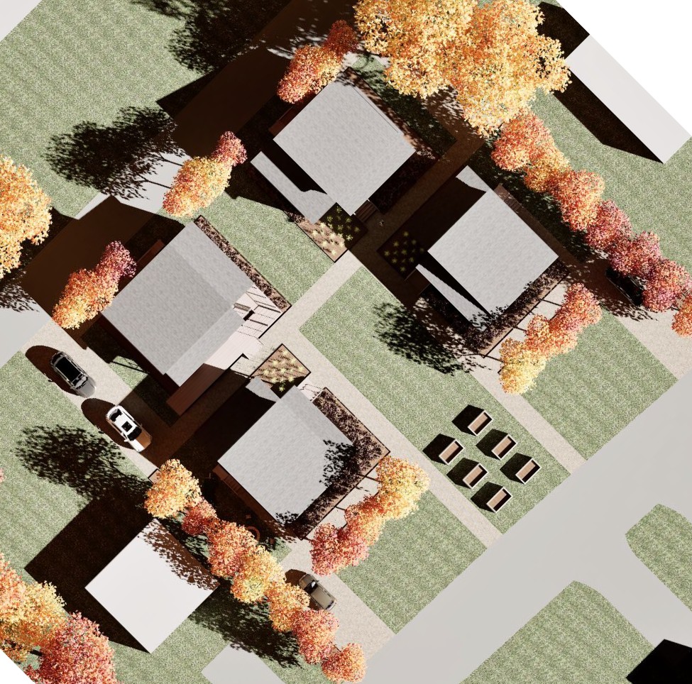 Project Description: At the beginning of the design process, the clients for the Zero Carbon Microhome – Habitat for Humanity of the Northern Flint Hills – charged the studio with developing a prototype home with a footprint less than 1000 ft2 that would contain two bedrooms and two bathrooms, with enough space for a household of three people. The ‘microhome’ designation was intended to appeal to first-time homeowners, small families, and retirees that were priced out of the Manhattan, Kansas metro housing market. Prior iterations of the studio had built 3-bedroom homes in the size range of 1200 to 1400 ft2, and the smaller footprint of the ZCMH would further reduce construction costs and allow four units of the ZCMH to be built in a “cottage cluster” where the middle of the site could be a shared green space (Figure 4), developed through HHNFH’s community land trust. The design of the ZCMH consisted of wings of private space (bedrooms and a bathroom) with an open public zone in the middle of the house that contained the kitchen, dining area, and living room, featuring a generous front porch, and a unified approach to structure and other building systems. Two small lots were purchased by HHNFH in Ogden, Kansas (within Manhattan’s metro area) where the cottage cluster of ZCMHs is being constructed.