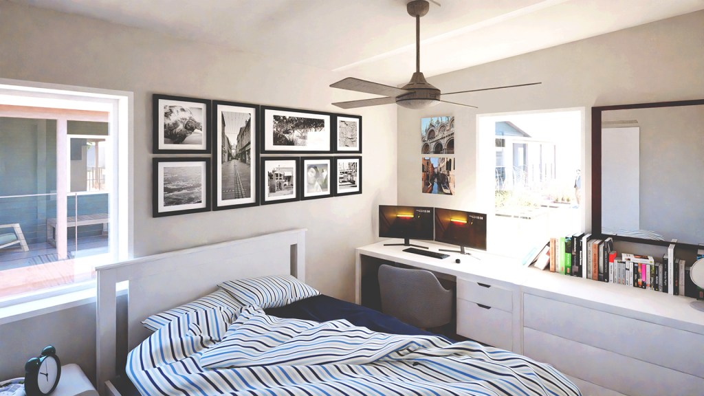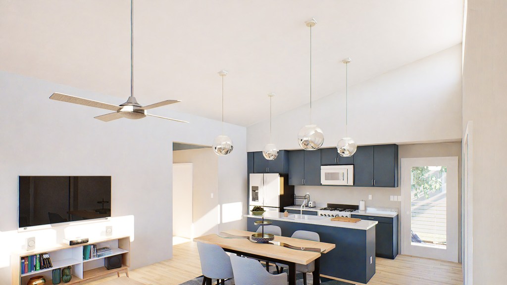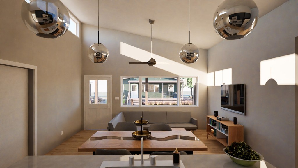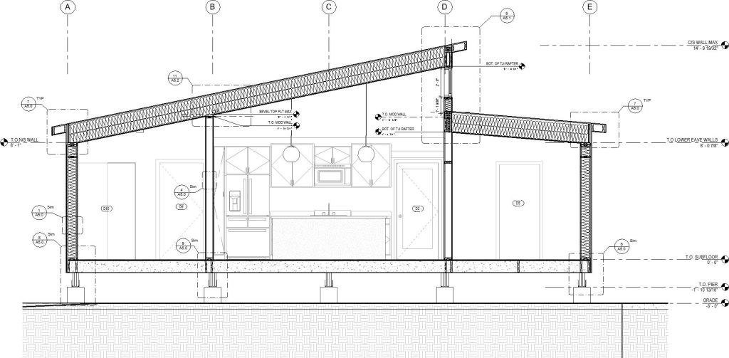 The house was prefabricated by the architecture studio at APDesign’s off-campus shop using a combination of flat-pack panels and volumetric modules that allowed the entire project to be shipped and places with forklifts, rather than cranes, while also enabling the ceiling height in the living room to surpass transport height limits typically associated with traditional modular construction. The home achieves zero carbon through a combination of roof-mounted PVs and super efficient envelope and building systems, while also integrating carbon negative hempcrete and hemp fiber insulation into the structure. A complete analysis of the home’s carbon footprint was undertaken in the article “Integrating hemp in a replicable model for affordable, low carbon housing: a zero carbon microhome prototype for the Kansas Flint Hills” available for view or download from the Projects page.