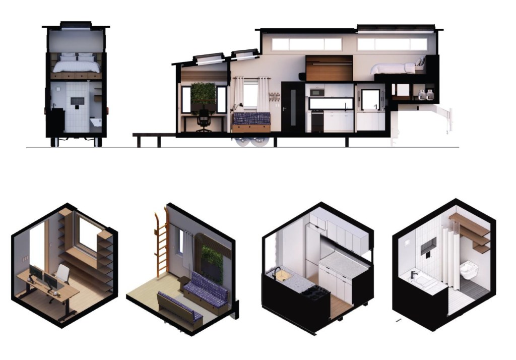 Spatially, modular and multifunctional design strategies maximize limited square footage while enabling personalization and long-term adaptability. Seamless technology integration supports evolving work styles, while flexible layouts transform underutilized zones into productive or restorative spaces. This tiny house model provides an innovative solution to address the intersection of housing insecurity, mental health, and shifting working environments and labor structures. It positions tiny mobile housing not as a constraint, but as an equitable, future-ready and affordable housing solution that provides freedom to select the place to live and work, and fosters autonomy, connection, and resilience in an increasingly competitive job market.
