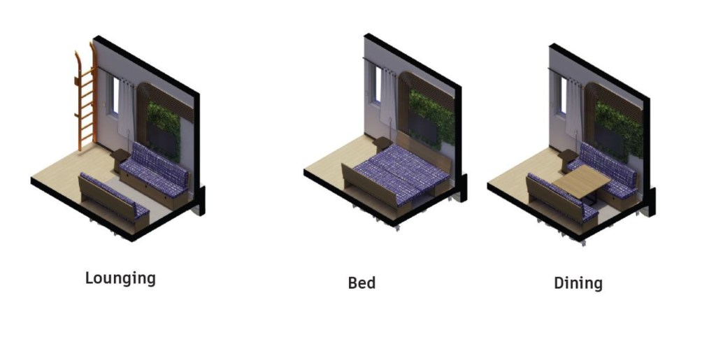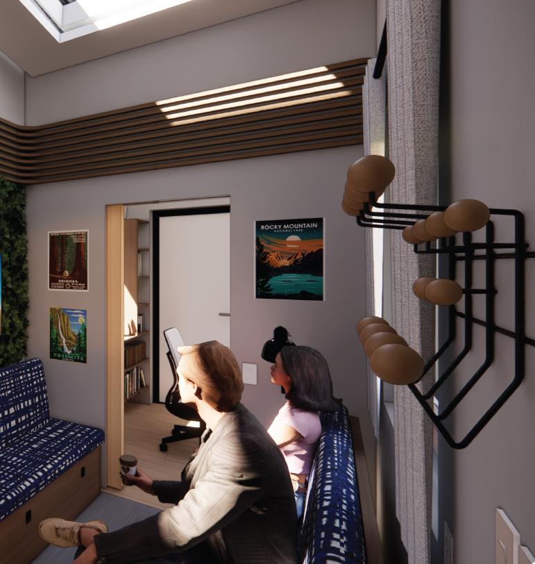 This project, designed by Andrew Myers, an Interior Architecture graduate student, guided by Professor Vibhavari Jani (Design) and Associate Professor Kutay Guler, proposes a tiny mobile housing model that reframes compact living as resilient, adaptive and affordable housing solution. Grounded in environmental psychology and biophilic design, the proposal integrates natural light, sensory-responsive environments, acoustic control, and material warmth to enhance cognitive performance, reduce stress, and improve overall well-being.