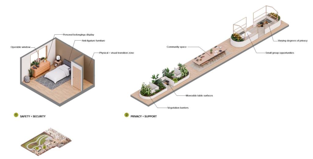 Biophilic strategies—healing gardens, natural materials, indoor plants —are paired with sensory-responsive design, offering environments that reduce stress and accommodate neurodiversity. Flexible, modular units adapt to changing needs, supporting continuity of care over time. Public-facing areas integrate community resources and programming, fostering social connection and strengthening neighborhood ties.