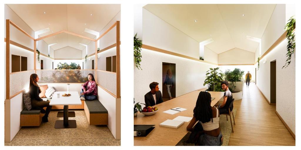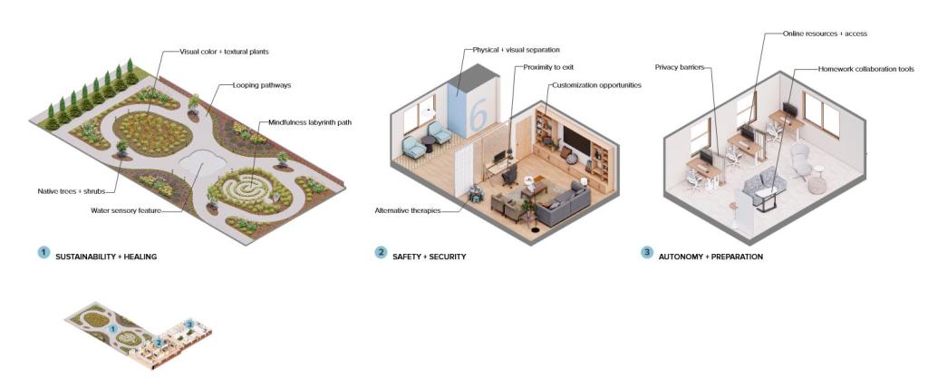 Executive Summary: In her graduate thesis, Interior Architecture student Kenna Hibbs, guided by Professor Vibhavari Jani (Design) and Associate Professor Kutay Guler (Programming), reframes mental health care through by introducing supportive housing, thereby positioning the built environment as a critical tool for long-term healing and well-being. In the United States, 1 in 5 adults experiences mental illness annually, yet most care models focus on short-term stabilization rather than sustained recovery. This proposal introduces a trauma-informed housing model that bridges the gap between clinical care and daily life. Designed as supportive residential infrastructure, it integrates autonomy, privacy, and community with biophilic and sensory-responsive environments. By fostering dignity, connection, and empowerment, the project provides a new prototype, advancing an innovative, scalable approach to mental health—transforming housing into a platform for resilience, recovery, and reintegration.